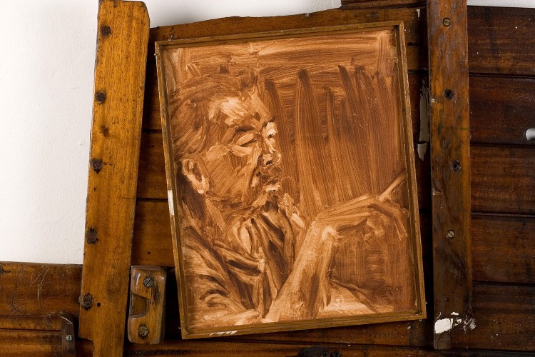 This painting was done in one sitting using one colour of oil paint and a cloth to wipe the paint off with.