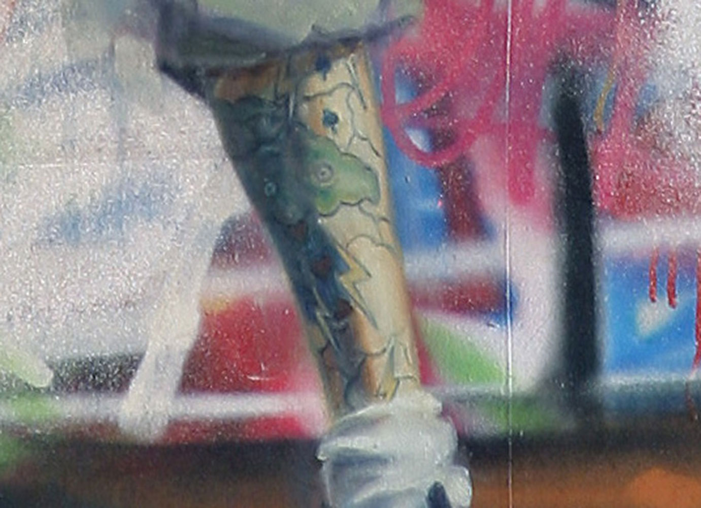 Anders is an airbrush artist, graffiti artist and tattooist. Some of the images on his leg are visible in the background graffiti.