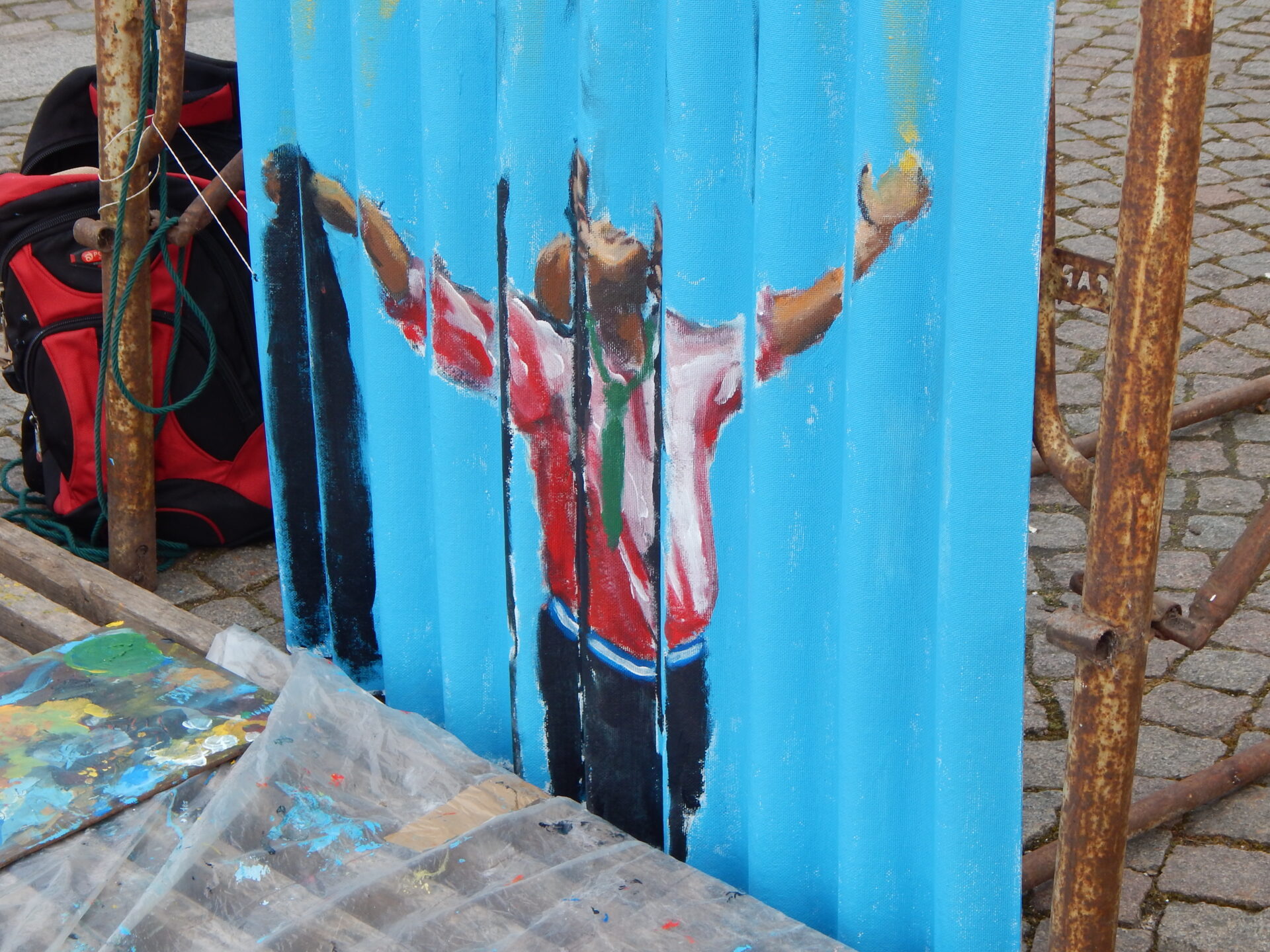 The colours I’ve chosen for this man’s clothes relate to relevant flags in the question of world unrest.