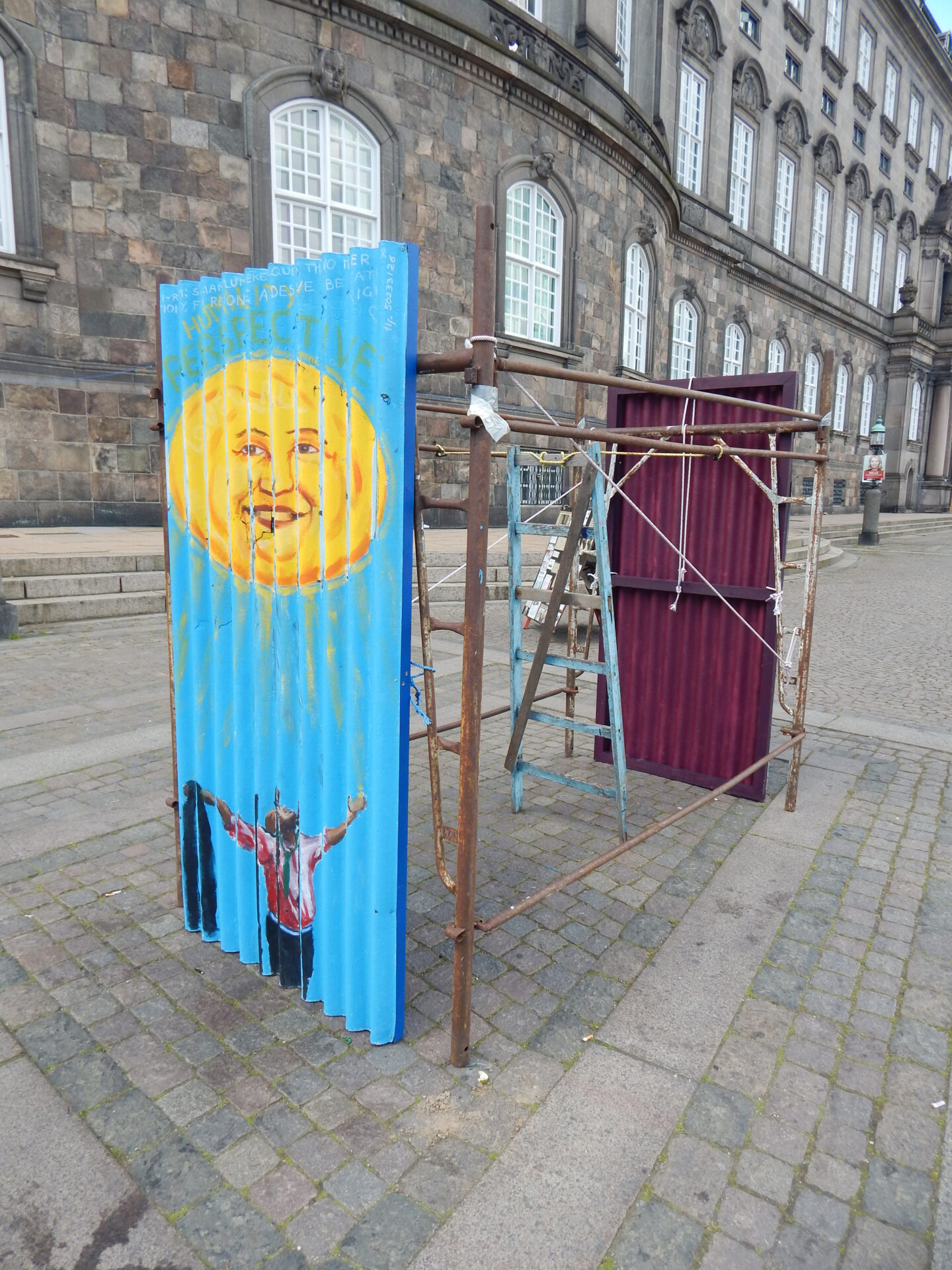 The Danish Queen’s birthday was filmed from here and my paintings were just shifted, not removed. Since then TV2 have built a temporary studio and there have been street parties around this area and still no human damage or confiscation. This is a good sign.