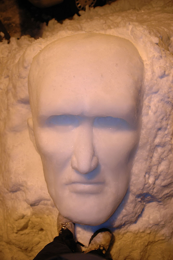 My technique for this sculpture is a mixure of building, carving and smoothing. I made slush in a bucket that could be modelled and then cut, carved and smoothed off.