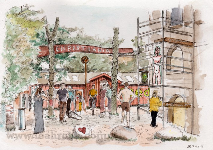2019 Watercolour and pen A5 The famous entrance to Christiania with my door, Den Friere, in the background.