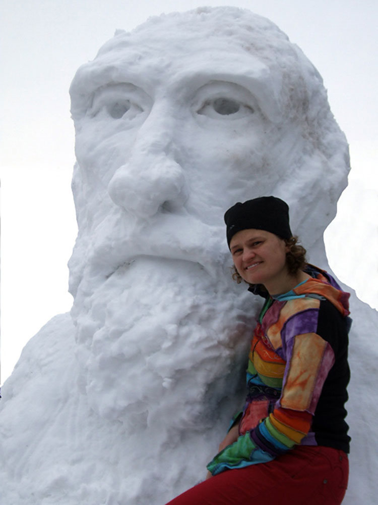 This is my biggest snow head to date. Scotland experienced a big freeze and the snow was too dry to sculpt with until the thaw came.