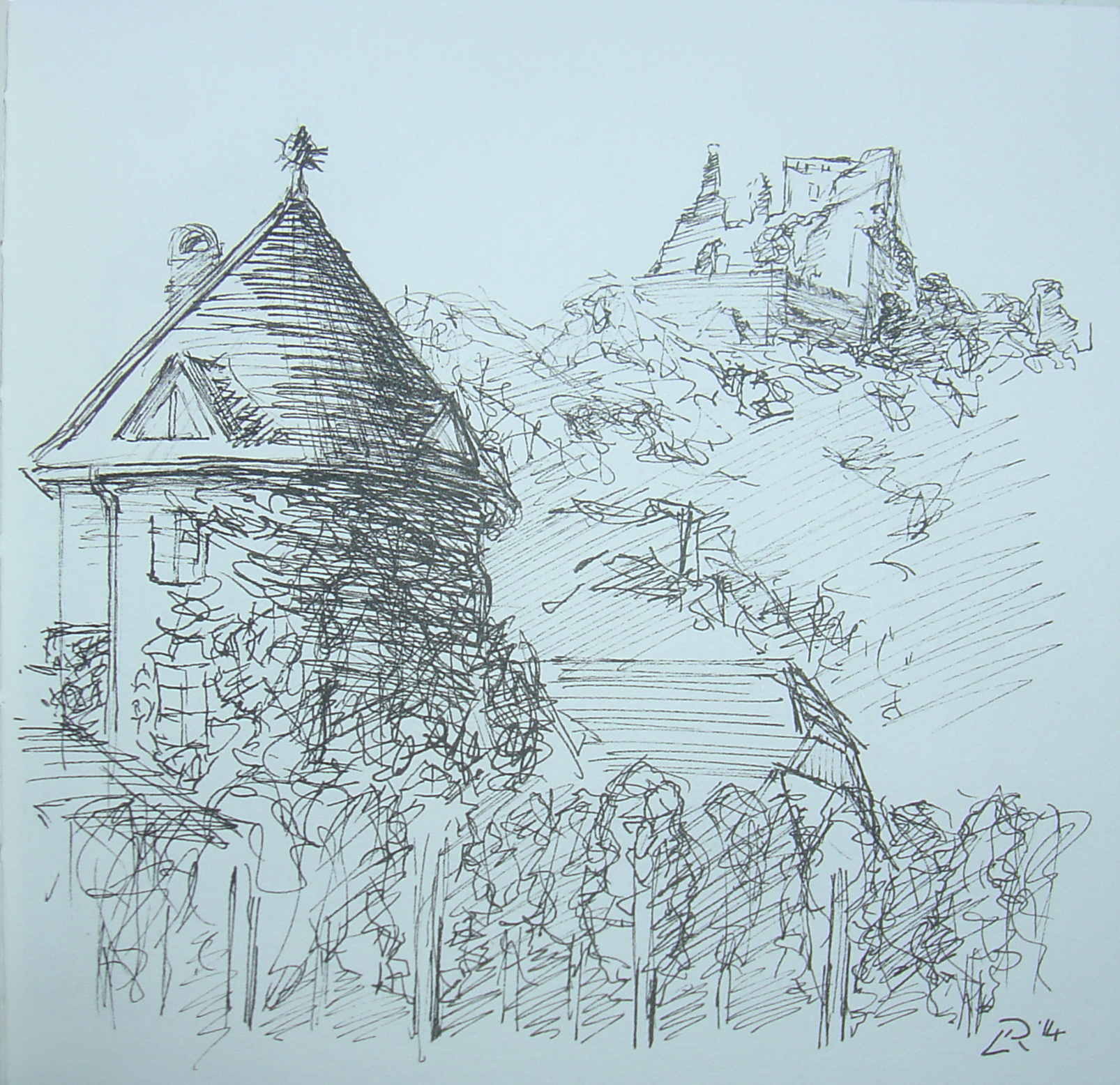 July 2014 Pen on paper 14x14cm I was taken by the attractive ruin on the hilltop.