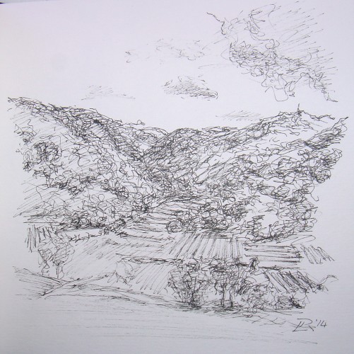 July 2014 Pen on paper 14x14cm Dürnstein has hundreds of rows of vines, making patterns in the landscape.