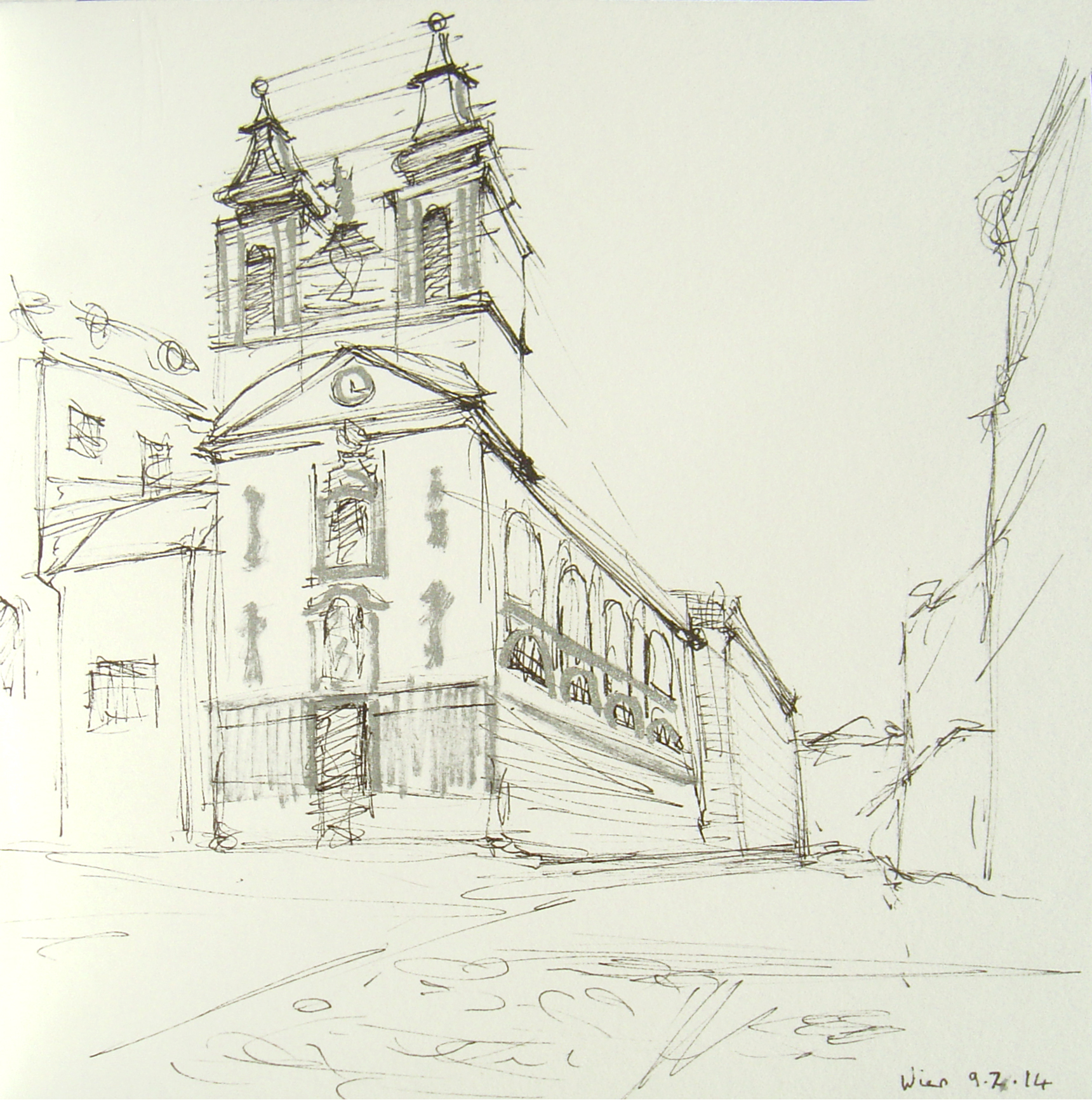 July 2014 Pen on paper 14x14cm Drawing of a building I saw in Vienna while waiting on a flight.